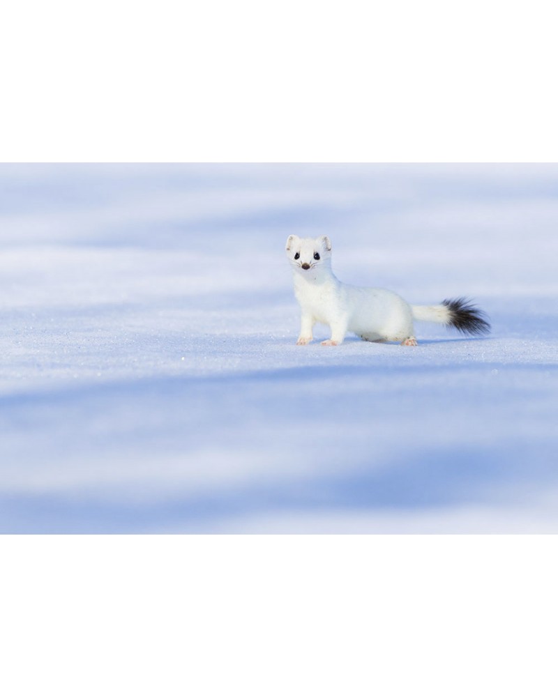 Depuis plusieurs semaines, j'observe les aller-retour de l'hermine dans la prairie. Elle passe parfois là où l'ombre des arbres teintent la neige de bleu. C'est là que je choisis de placer mon affut pour offrir ce décor à ce magnifique animal.