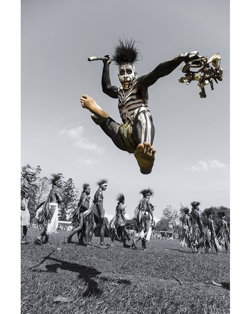 Un homme guerrier de la tribu des "Skeleton men" faisant un saut en direction du photographe. Cette photo à été prise lors du "Mt Hagen cultural show" en Papouasie Nouvelle guinée. Lors de cet événement des tribus de tout le pays se réunissent pour mettre en avant leurs cultures et leurs traditions.