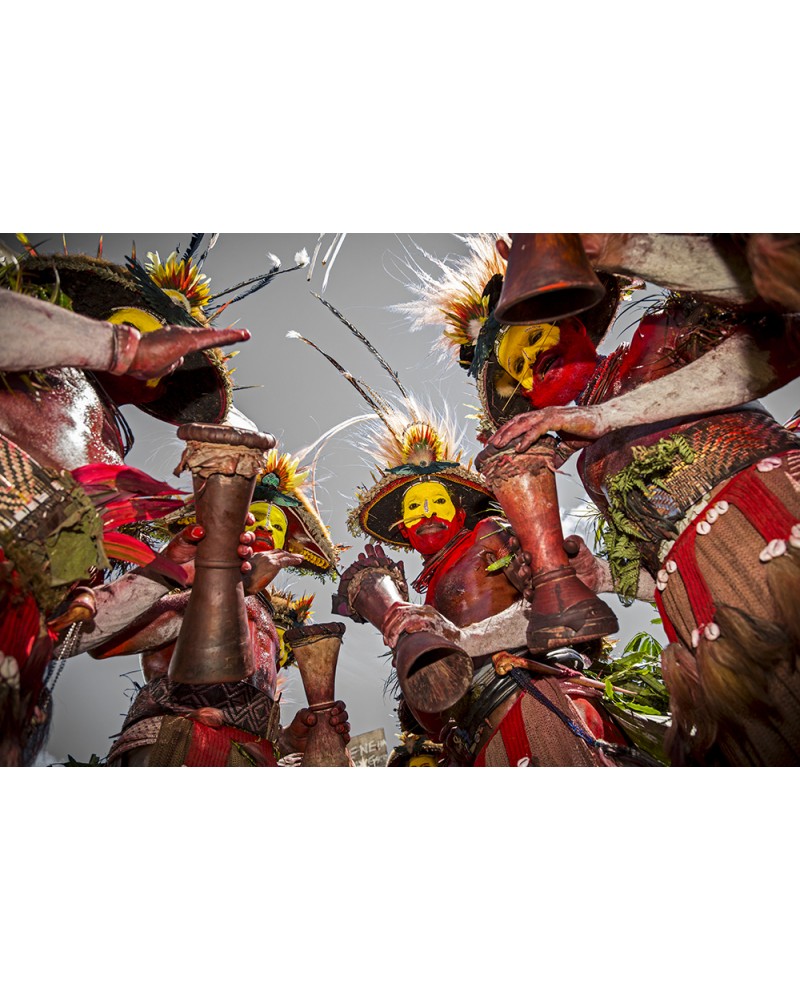 Un sing sing de la tribu des Huli jouant de la percussion traditionnelle : le Kundu. Cette tribu s'inspire de la danse des oiseaux de paradis de leur région. Cette photo à été prise lors du "Mt Hagen cultural show" en Papouasie Nouvelle Guinée. Lors de cet événement des tribus de tout le pays se réunissent pour mettre en avant leurs cultures et leurs traditions.