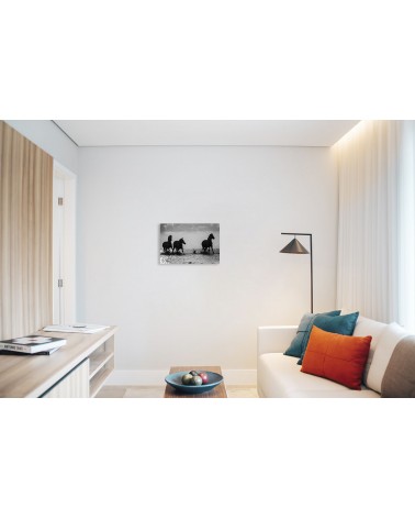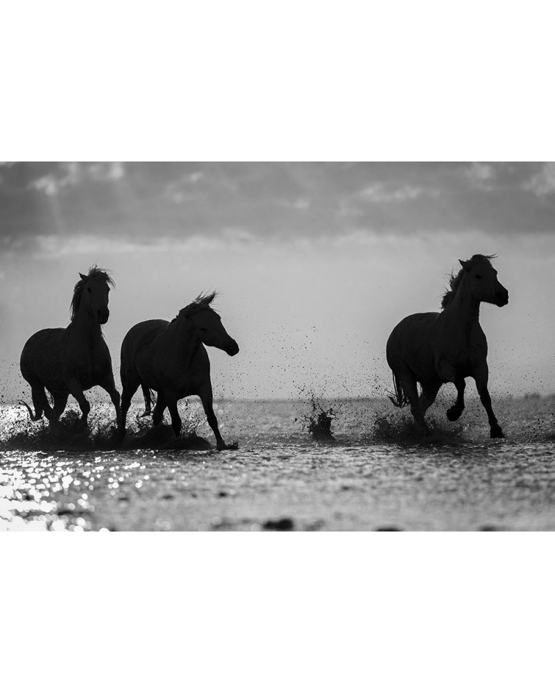 Image en noir et blanc, illustrant des chevaux camarguais galopant dans un étang en contre jour