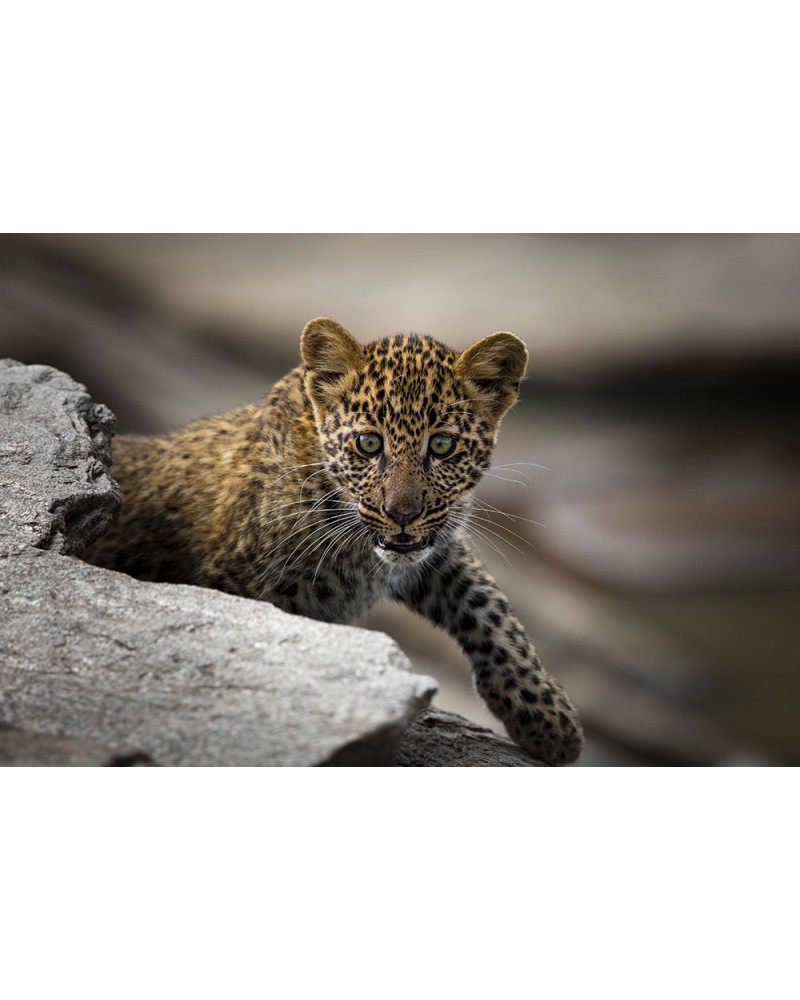 Encouragé par sa mère, ce tout jeune léopard sort de sa tanière, fait quelques pas à l'extérieur et découvre avec surprise et curiosité le monde qui l'entoure et dans lequel il grandira.